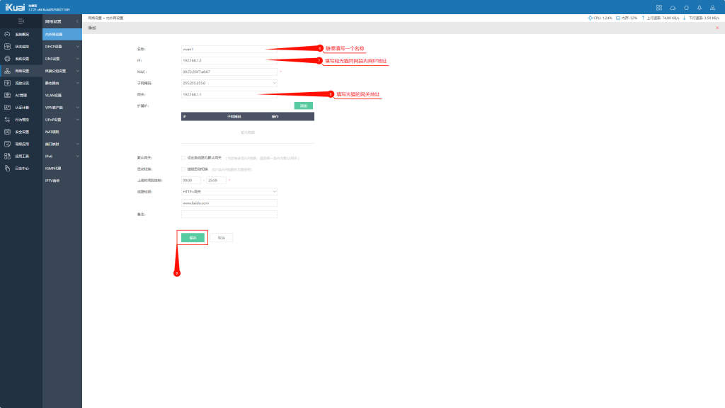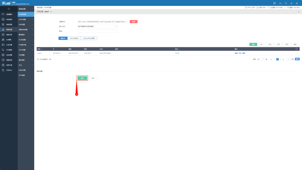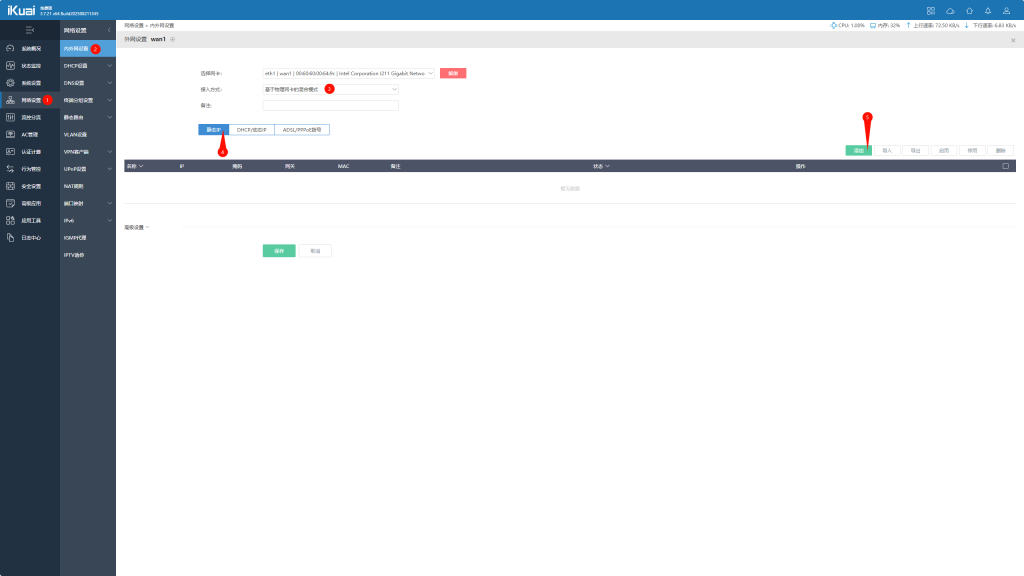 - 在 WAN 口设置中,添加一个静态 IP 地址,并与光猫保持同一网段。 例如:光猫网关是 192.168.1.1,则在爱快 WAN 口上添加 192.168.1.2。